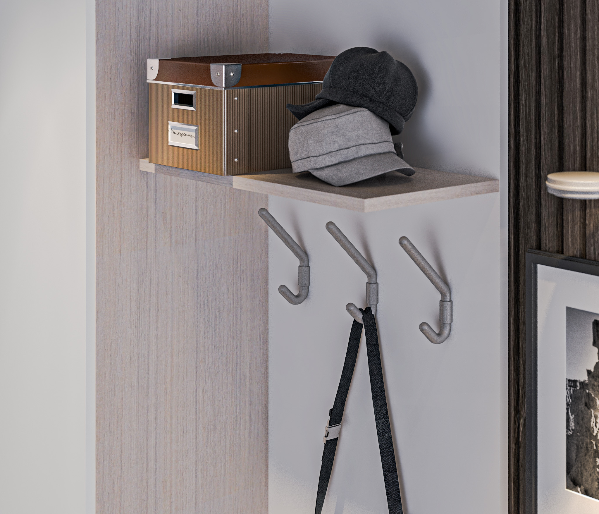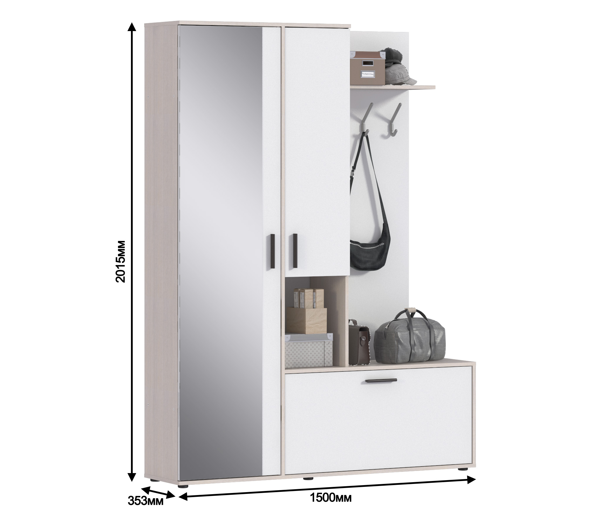 Прихожая «Саша» - компактная и функциональная мебель, которая будет вас встречать и провожать каждый день. Вместительный шкаф для одежды вмещает 10 вешалок, тумба под коробки и мелочь с 4-мя полками, обувной отдел для 18 пар обуви, и важная деталь - зеркало, которое позволяет разглядеть себя в полный рост.