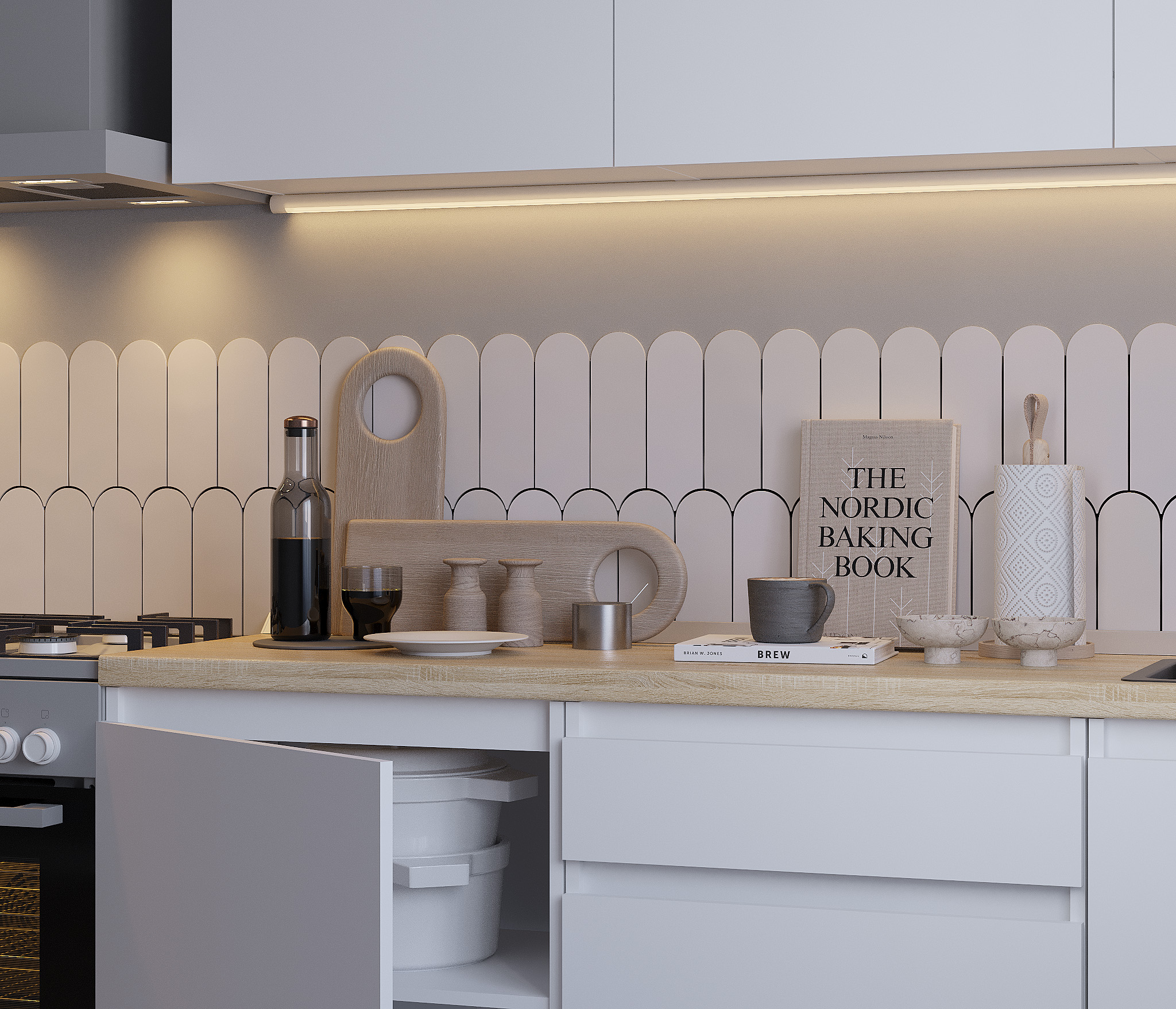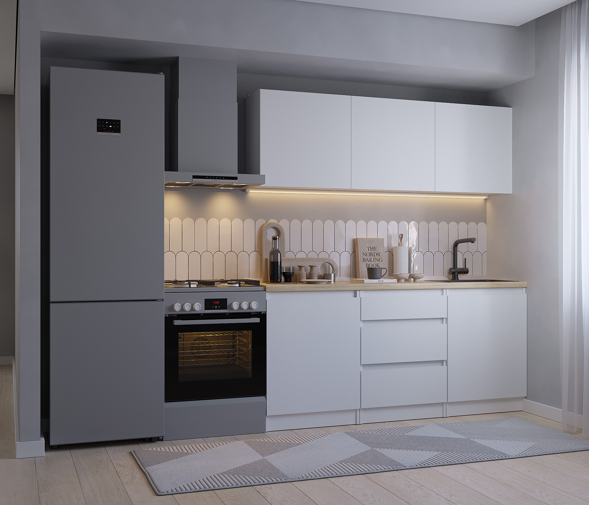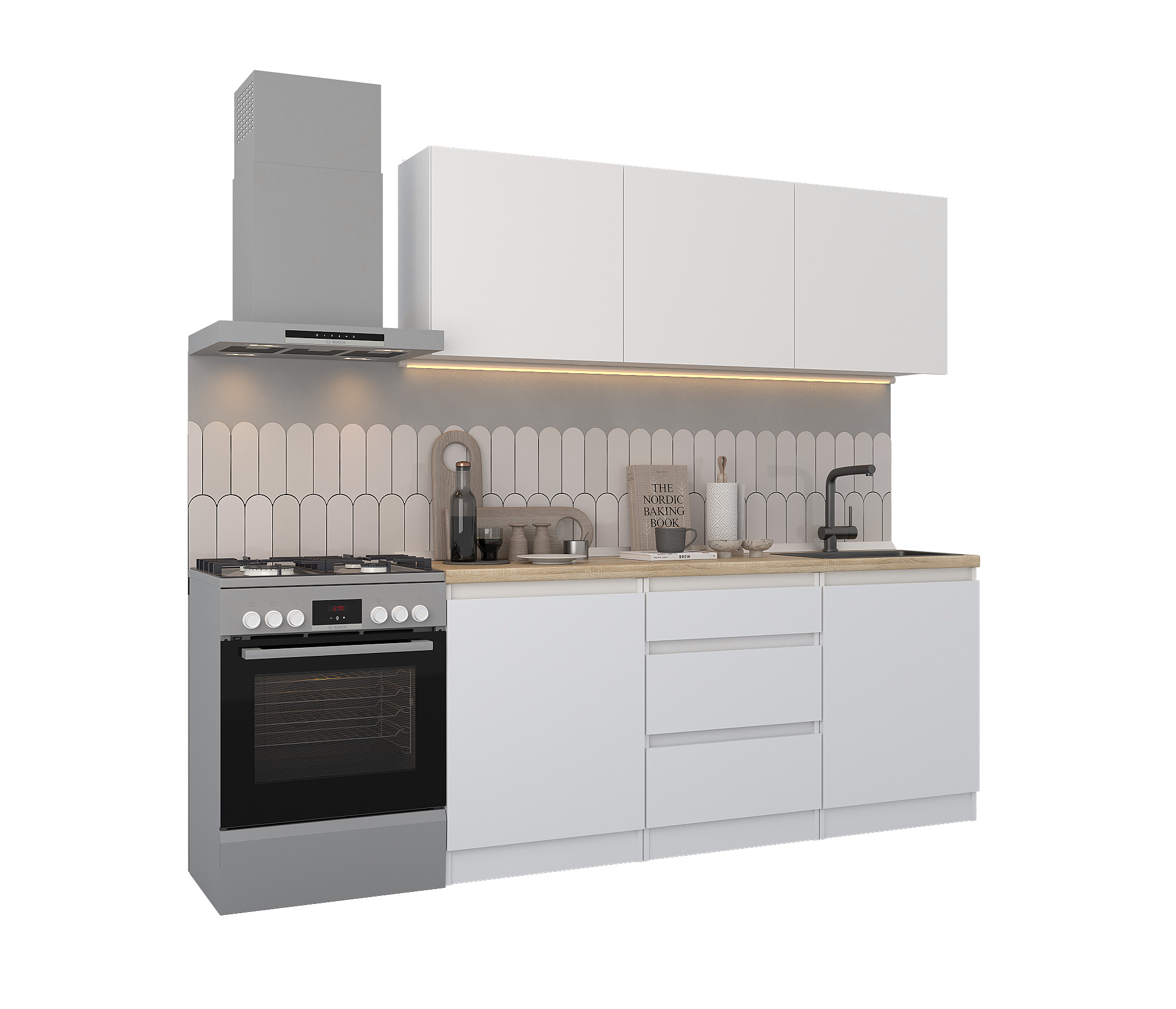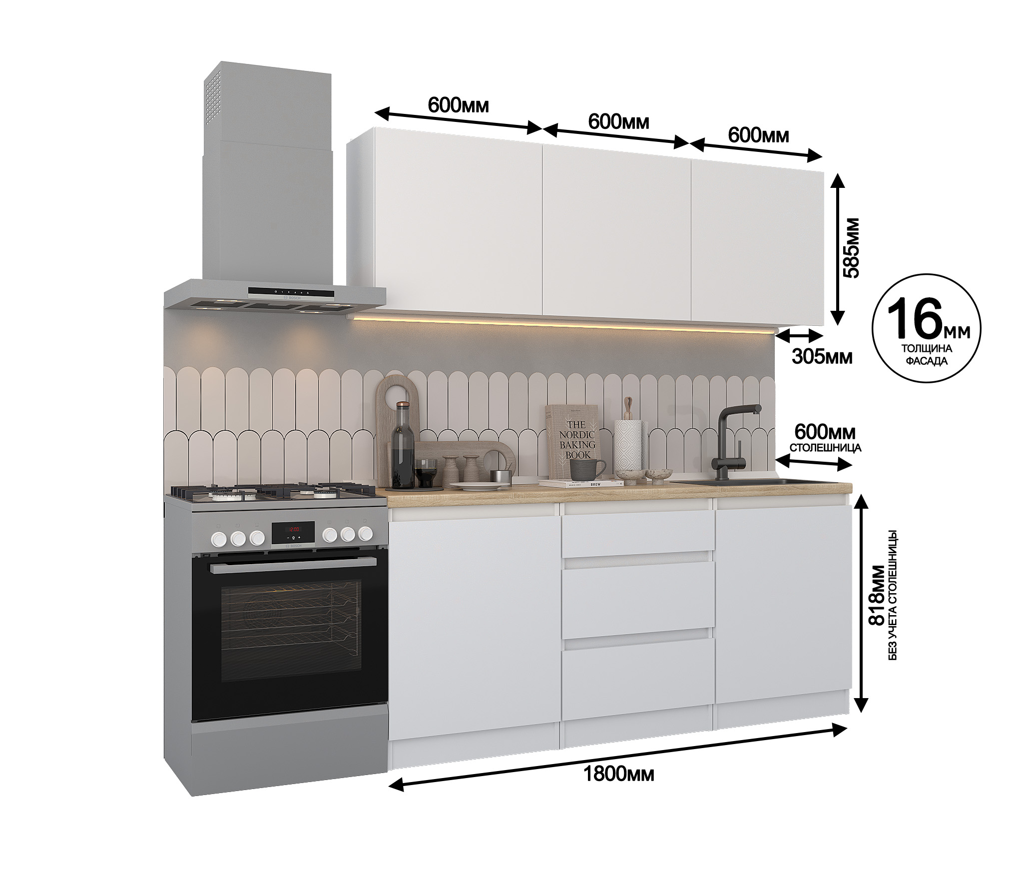 Кухня Леон сочетает в себе функциональность, стиль и доступность, и является прекрасным выбором для тех, кто ищет компактное и удобное решение для своей кухни. Кухонный гарнитур Леон идеально подходит для помещений с ограниченным пространством. Корпус и фасады выполнены из белого ЛДСП. Фасады столов и шкафов не имеют лицевой фурнитуры и открываются захватом за тыльный край фасада. Леон смотрится современно, а отсутствие ручек упрощает уход за поверхностью.