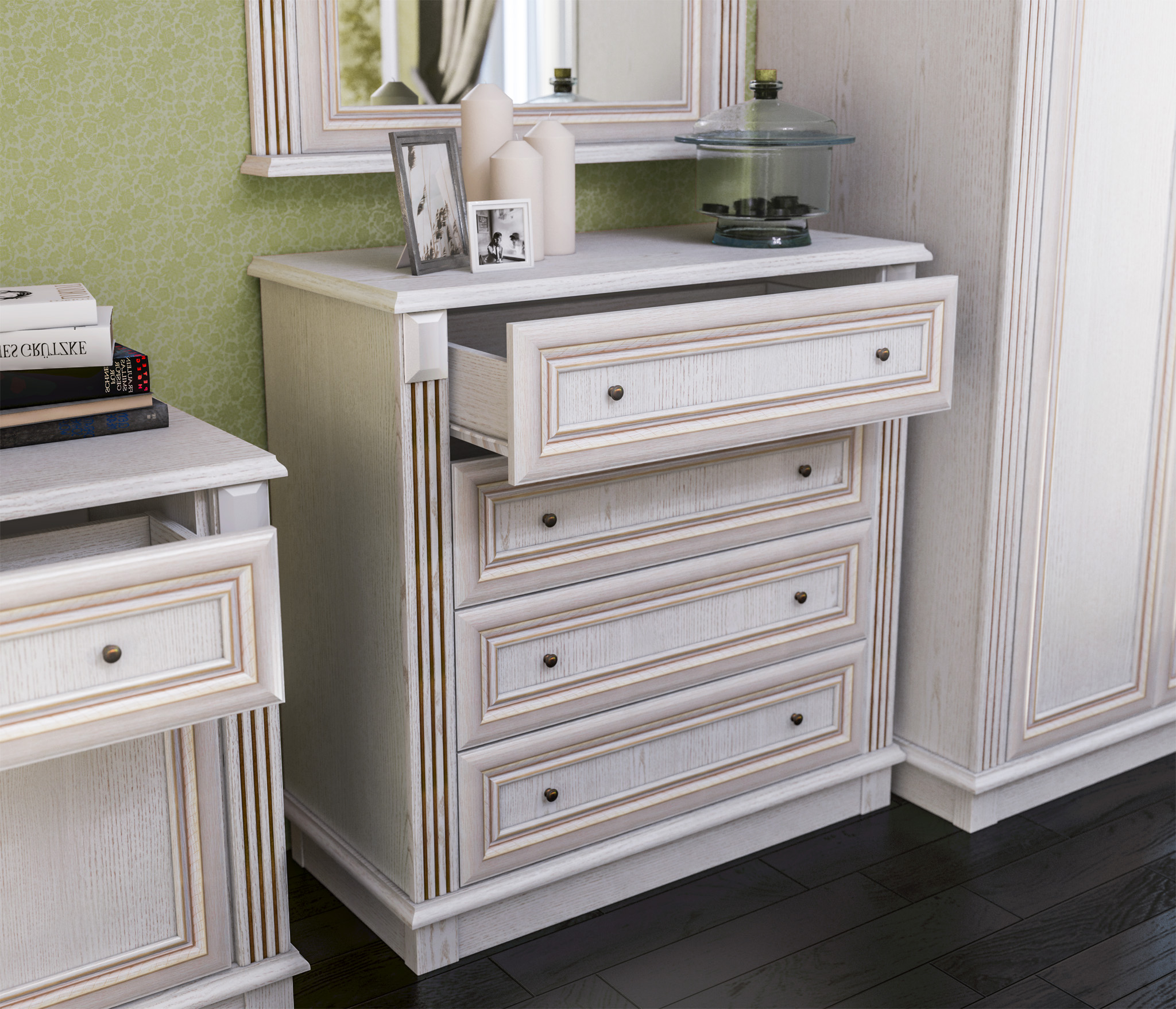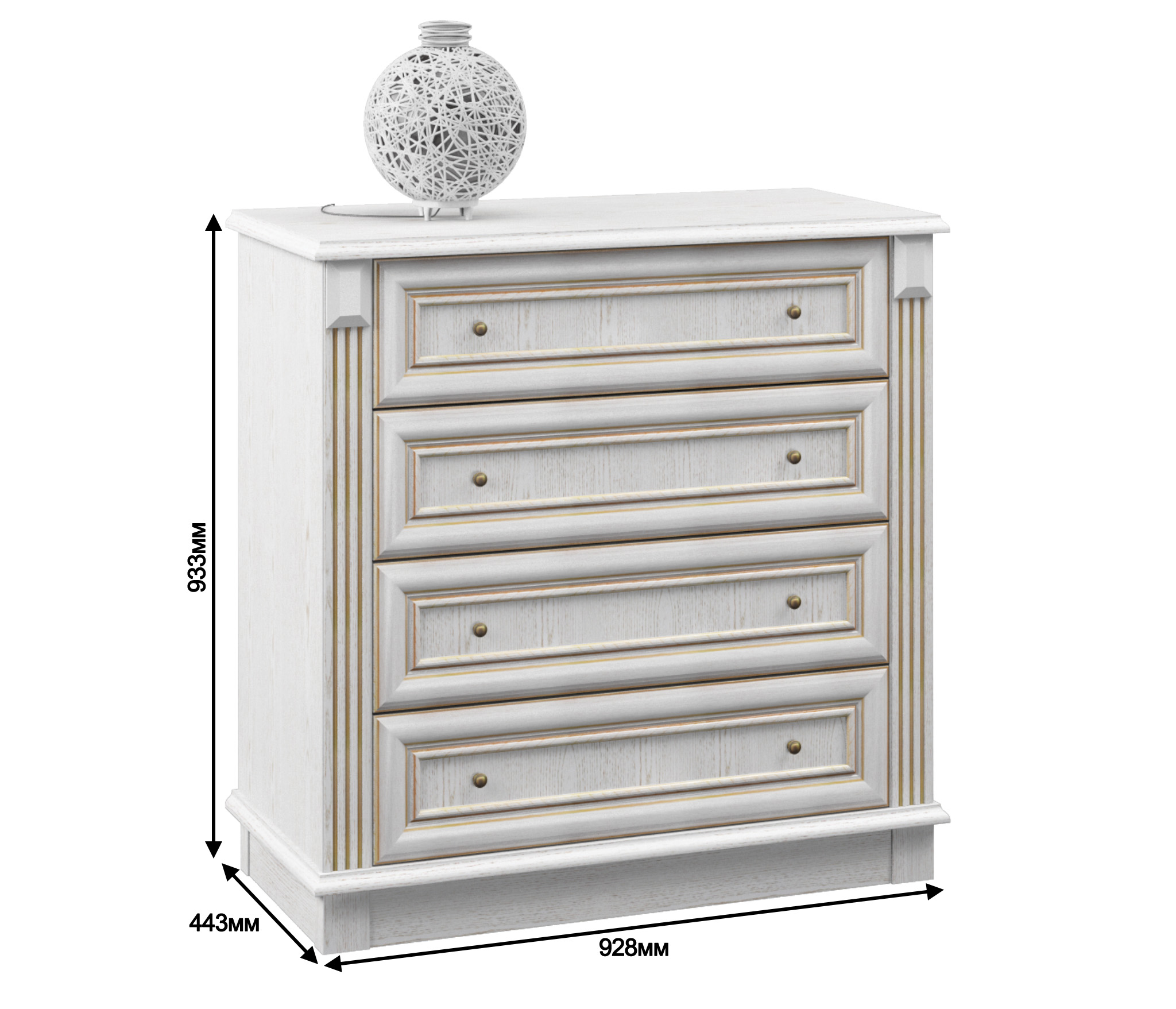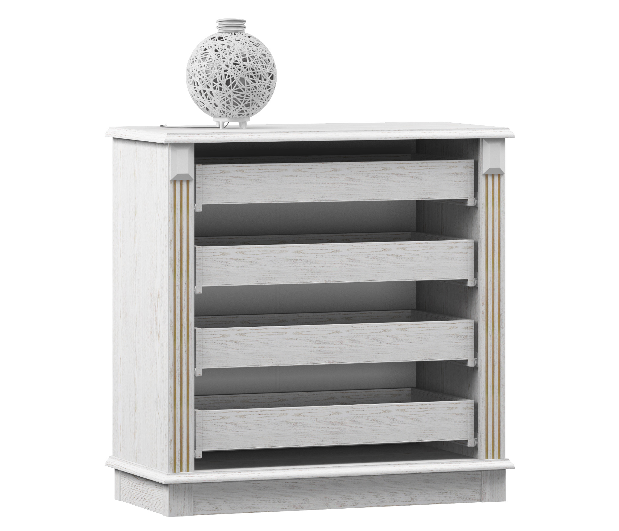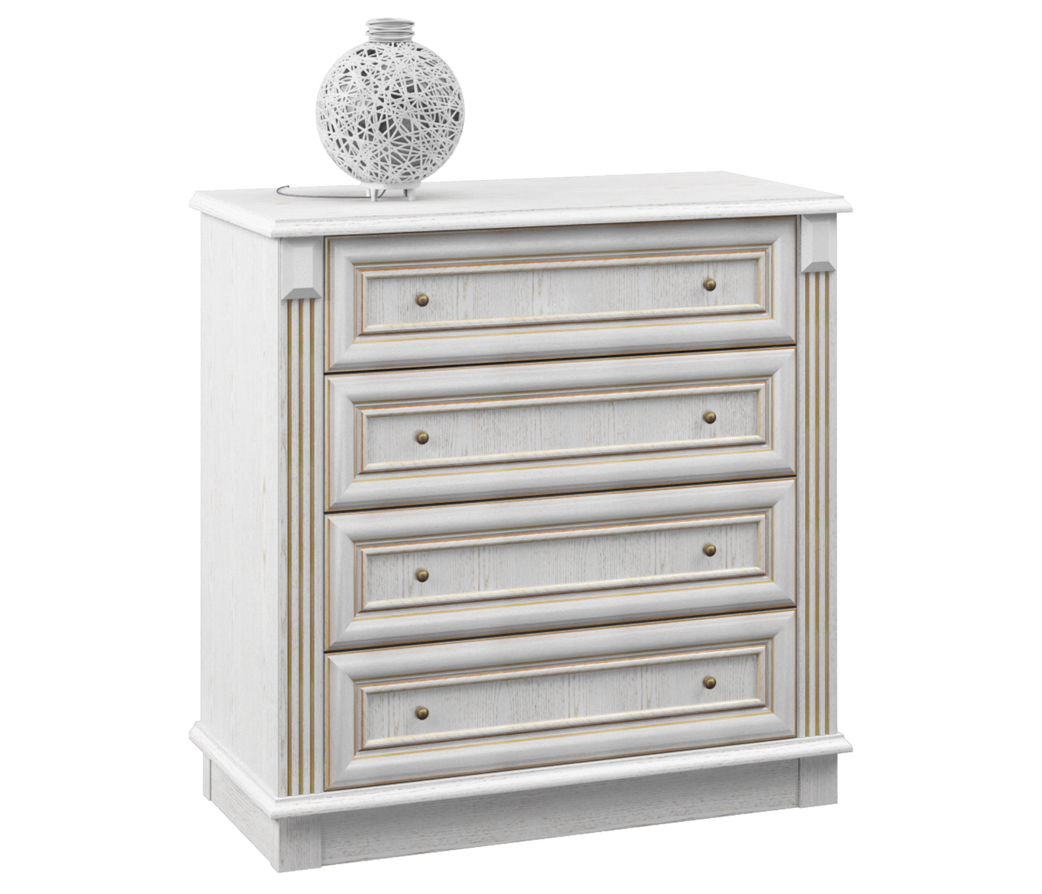 Практичность модели «Версаль» несомненна. Четыре выдвижных ящика отлично справляются с хранением полотенец, салфеток и других вещей, которым отчаянно не хватает места. Свежие цветы, декоративные вазы и памятные фотоснимки будут прекрасно себя чувствовать на верхней поверхности комода. Окажитесь в Версале, не выходя из дома!