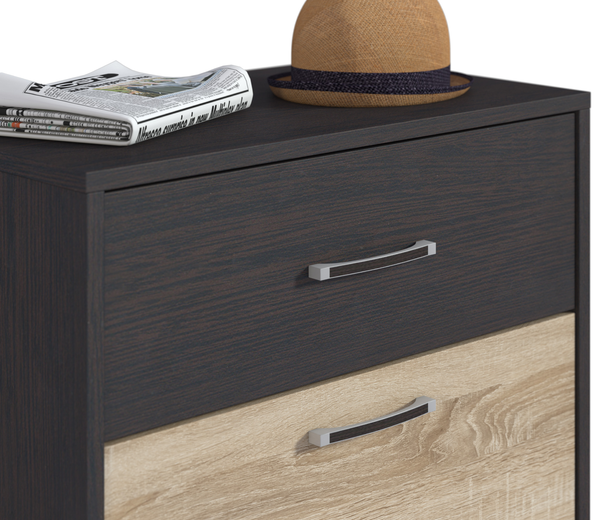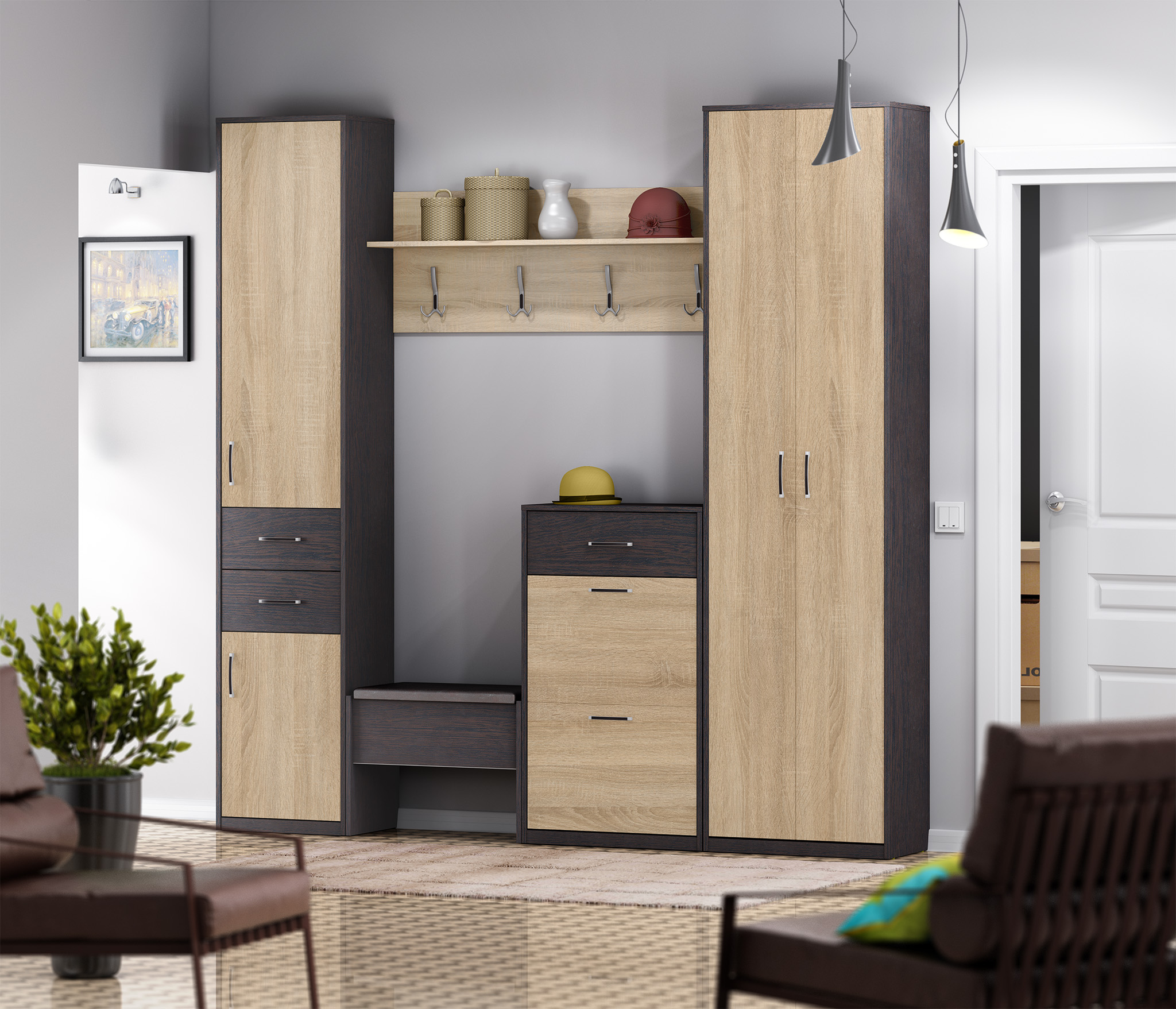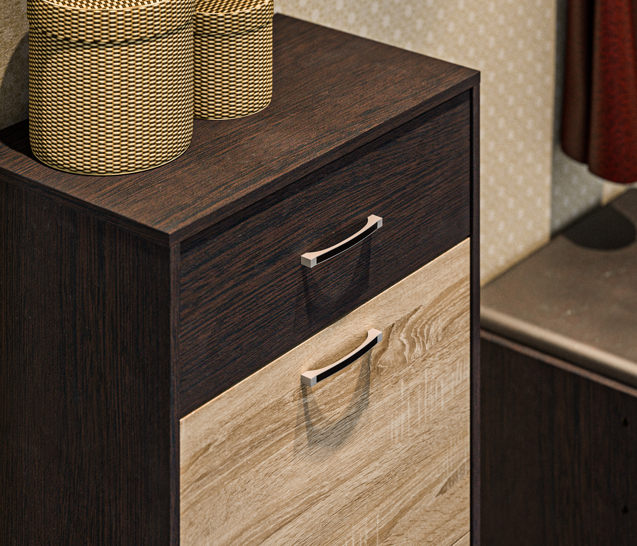 Стильный дизайн тумбы позволяет ей идеально вписаться в интерьер любой прихожей. Благородное сочетание оттенков Венге и Дуб Сонома будет превосходно смотреться как в окружении яркой обстановки, так и рядом с мебелью сдержанных тонов. Материал отделки ЛДСП устойчив к влаге и воздействию бытовых чистящих средств.