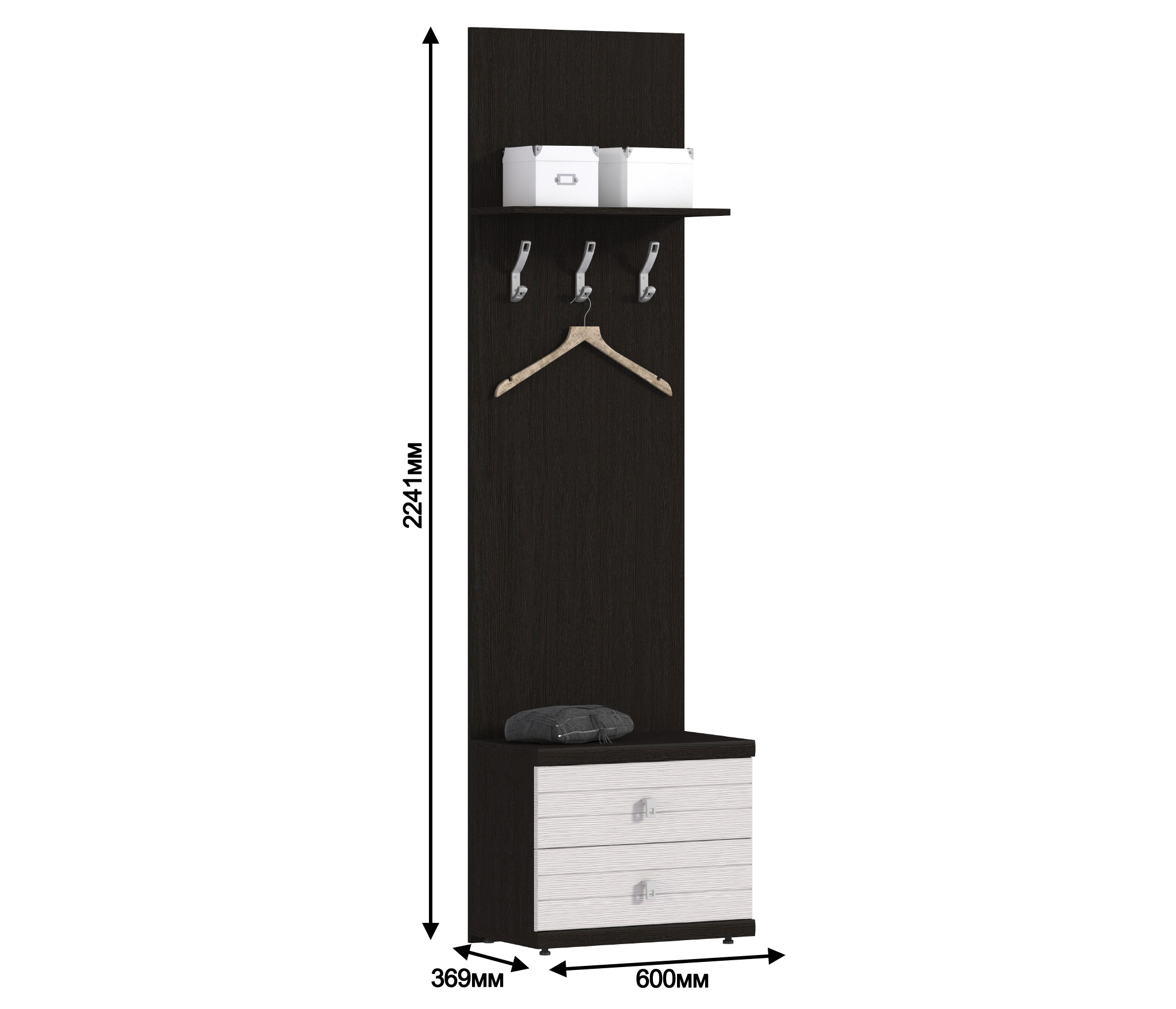 Эта компактная вешалка с тумбой впишется в интерьер даже небольшой прихожей. В двух просторных ящиках тумбы удобно хранить аксессуары. Сверху находится открытая полка. Полезного пространства должно быть много.