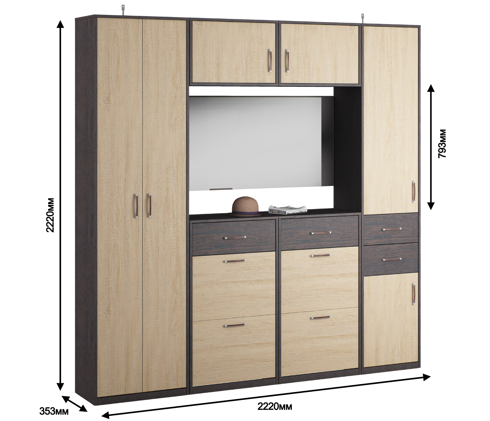 Набор с обувницами «Афина» может стать модной функциональной зоной вашей прихожей. Каждая деталь комплекта выдержана в едином стиле, что обеспечивает создание гармоничной композиции. Благородное сочетание оттенков «Венге» и «Дуб Сонома» всегда актуально и великолепно впишется в любой интерьер. В набор включены два шкафа, обувная тумба и навесная полка – все вместе они представляют собой удобную систему для хранения каждой детали гардероба, а также различных мелочей, которые неизменно скапливаются в квартире. Высокое качество изготовления комплекта «Афина» – залог долговечности мебели.