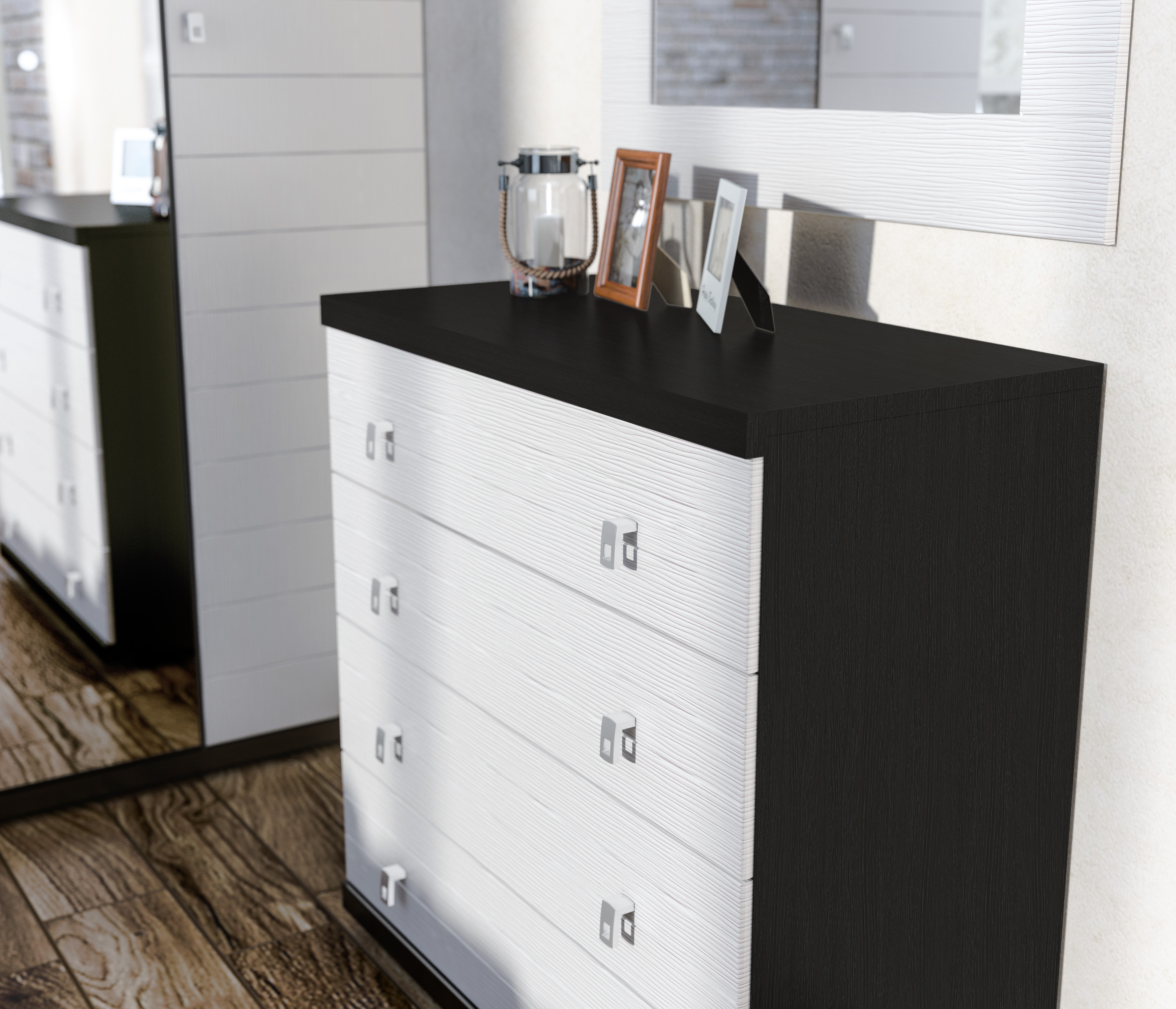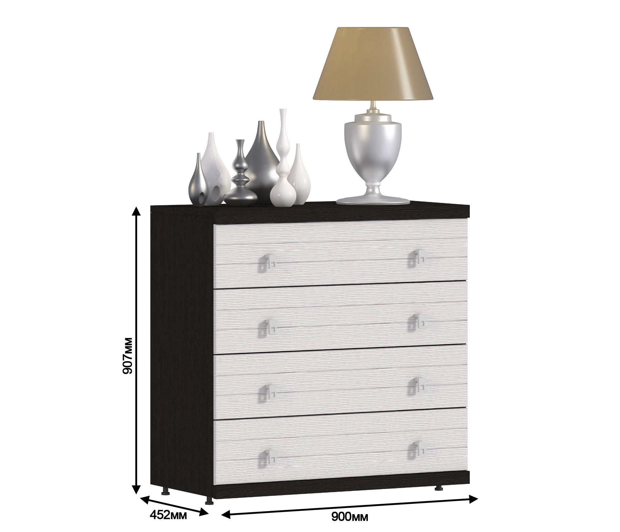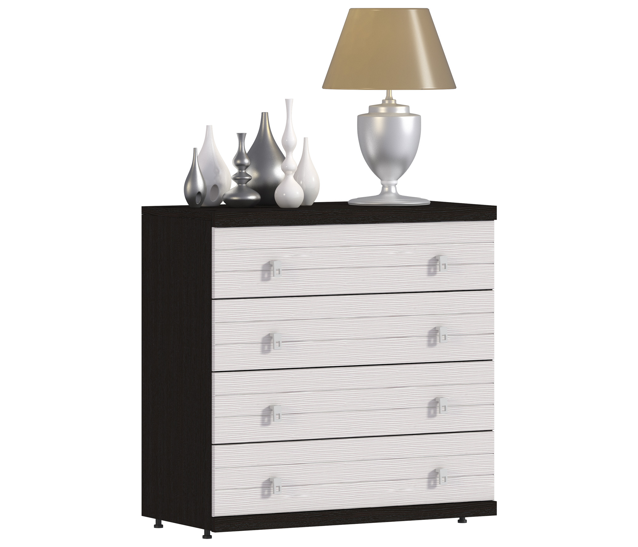 Стильный комод с четырьмя ящиками. Он займет достойное место я спальне или гостиной. Все детали комода сделаны из прочной экологически чистой прессованной древесины. Цвета комода: «вишня Барселона-клён» и «дуб Феррара».