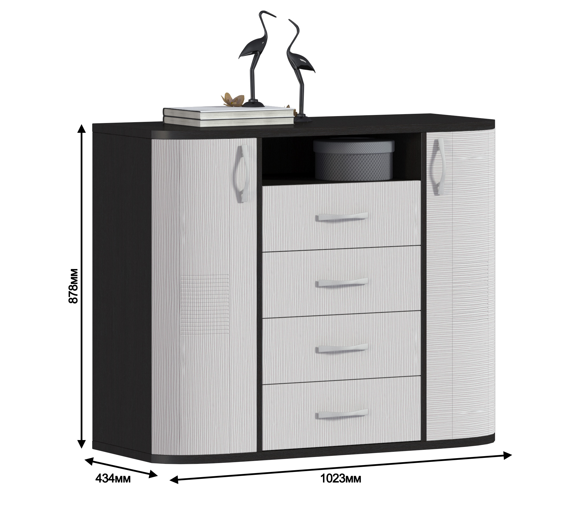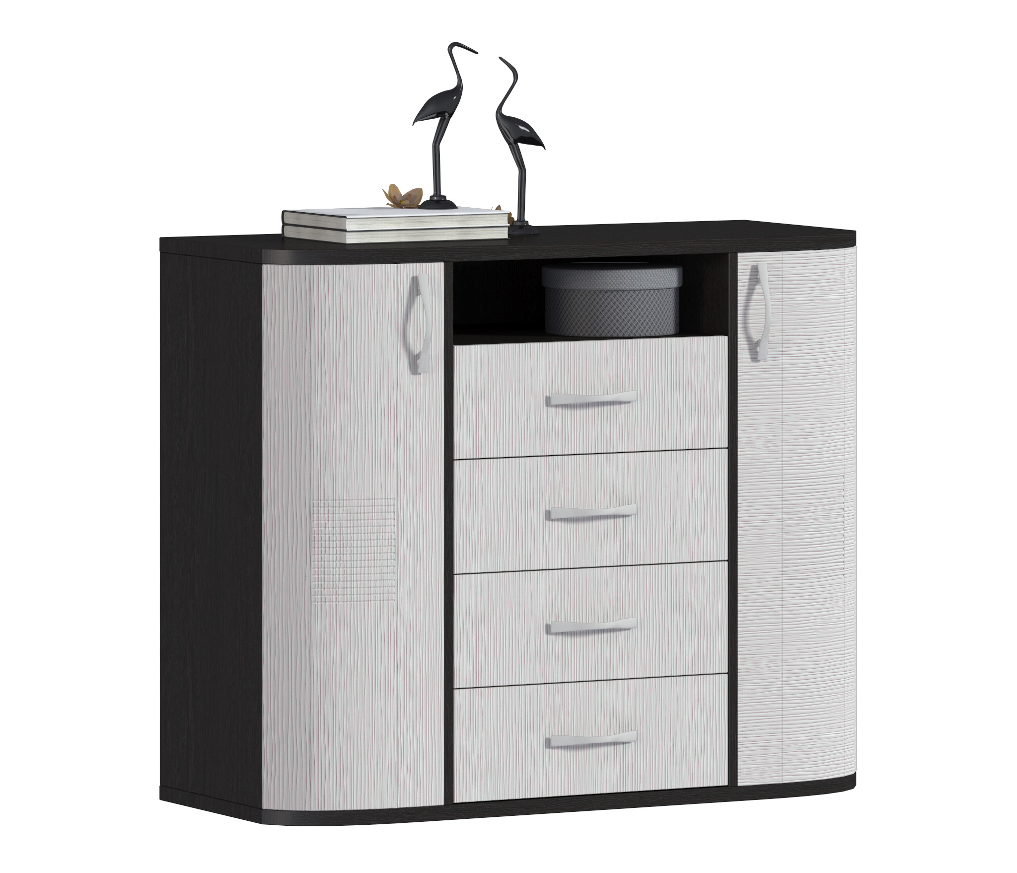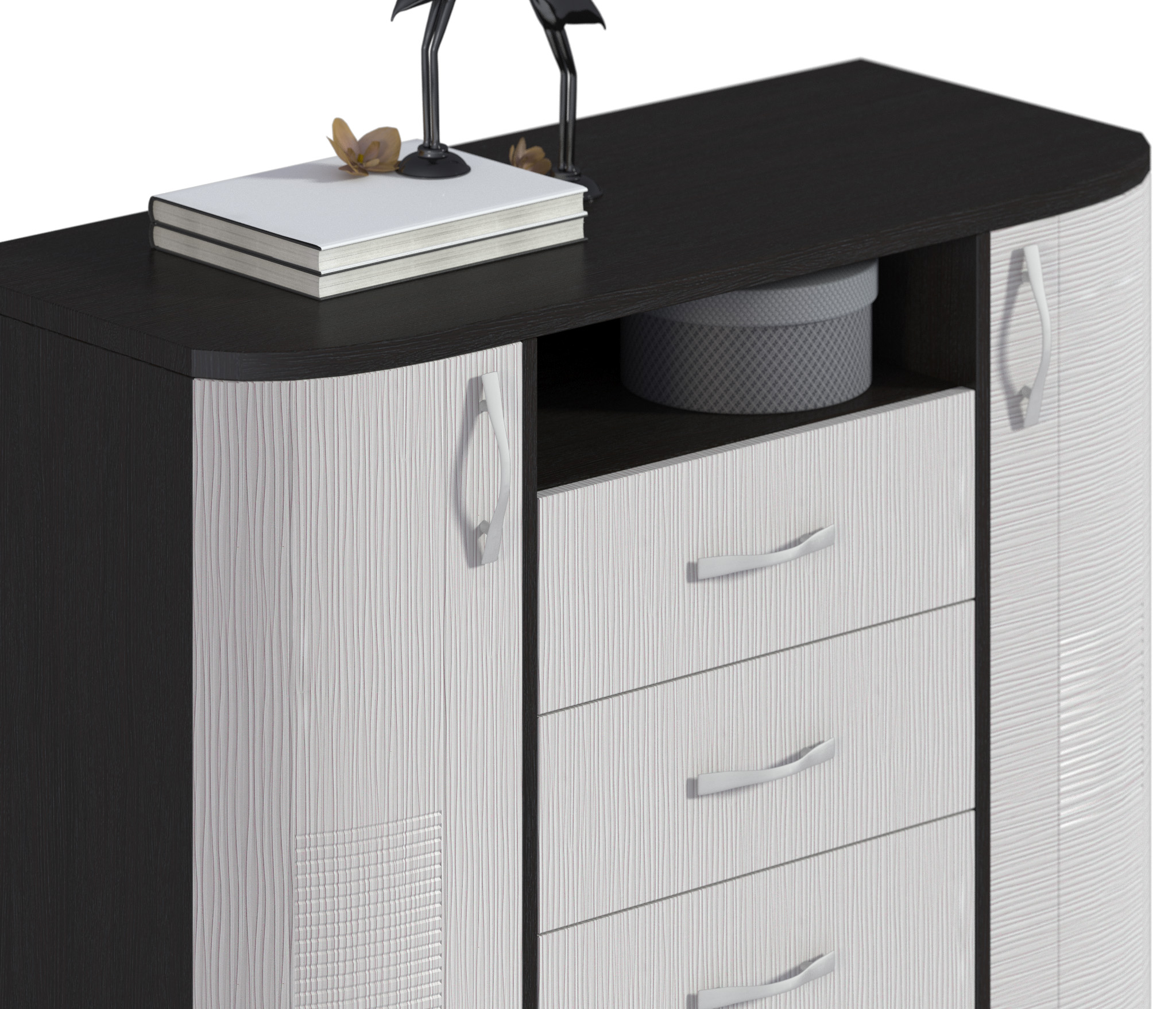 Комод очень понравился. Стильный, современный, закругленные боковинки. Хорошо смотрится и сам по себе и в сочетании с другой мебелью из этой серии. Удобные ящики с хорошими направляющим. Сверху широкая столешница особо порадовала. Покупкой довольны. Рекомендуем.
