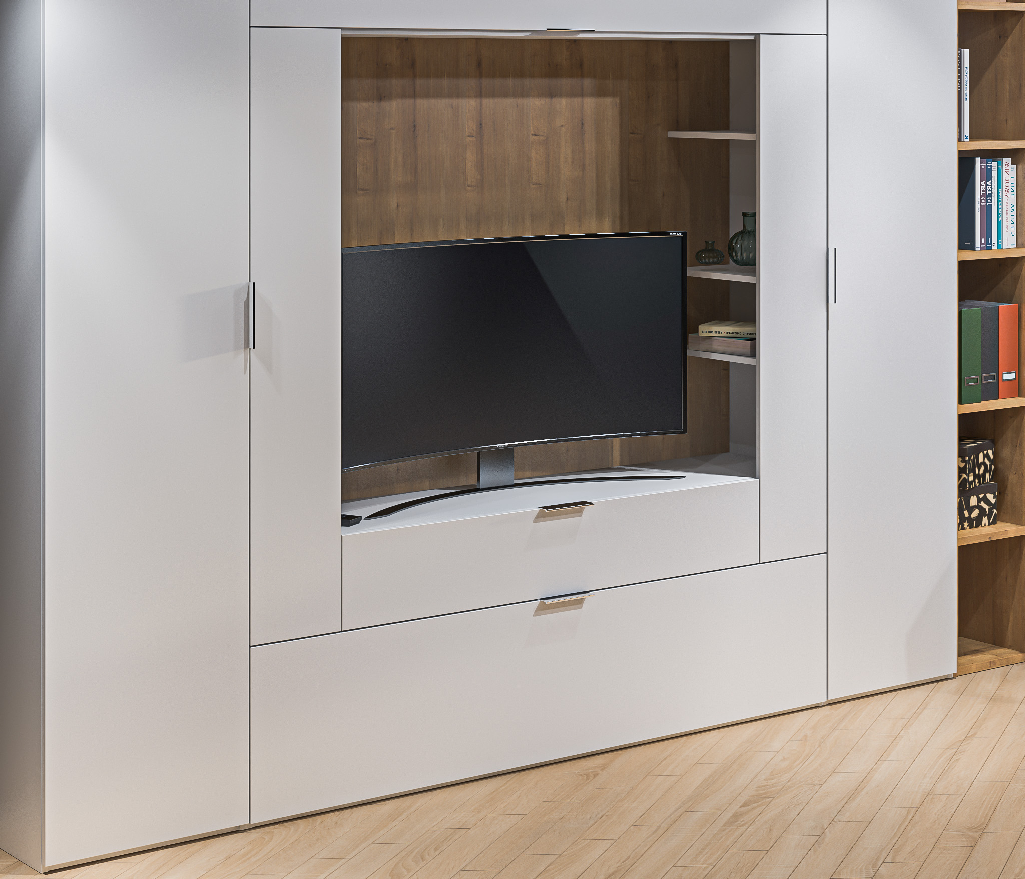 Стенка СБ-3265 имеет удобные и вместительные ящики для вещей и аксессуаров, а также позволит разместить ТВ с диагональю до 55";