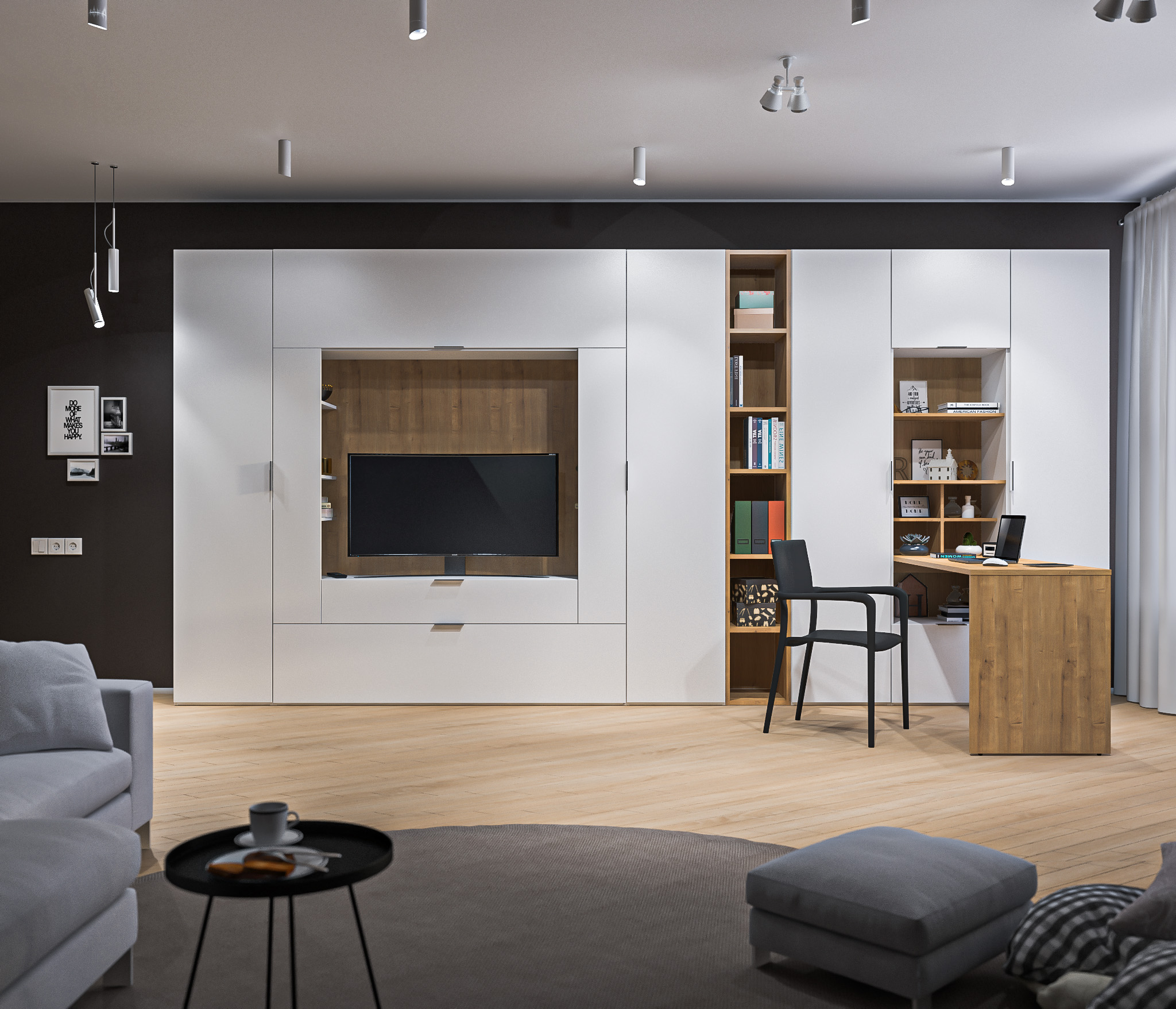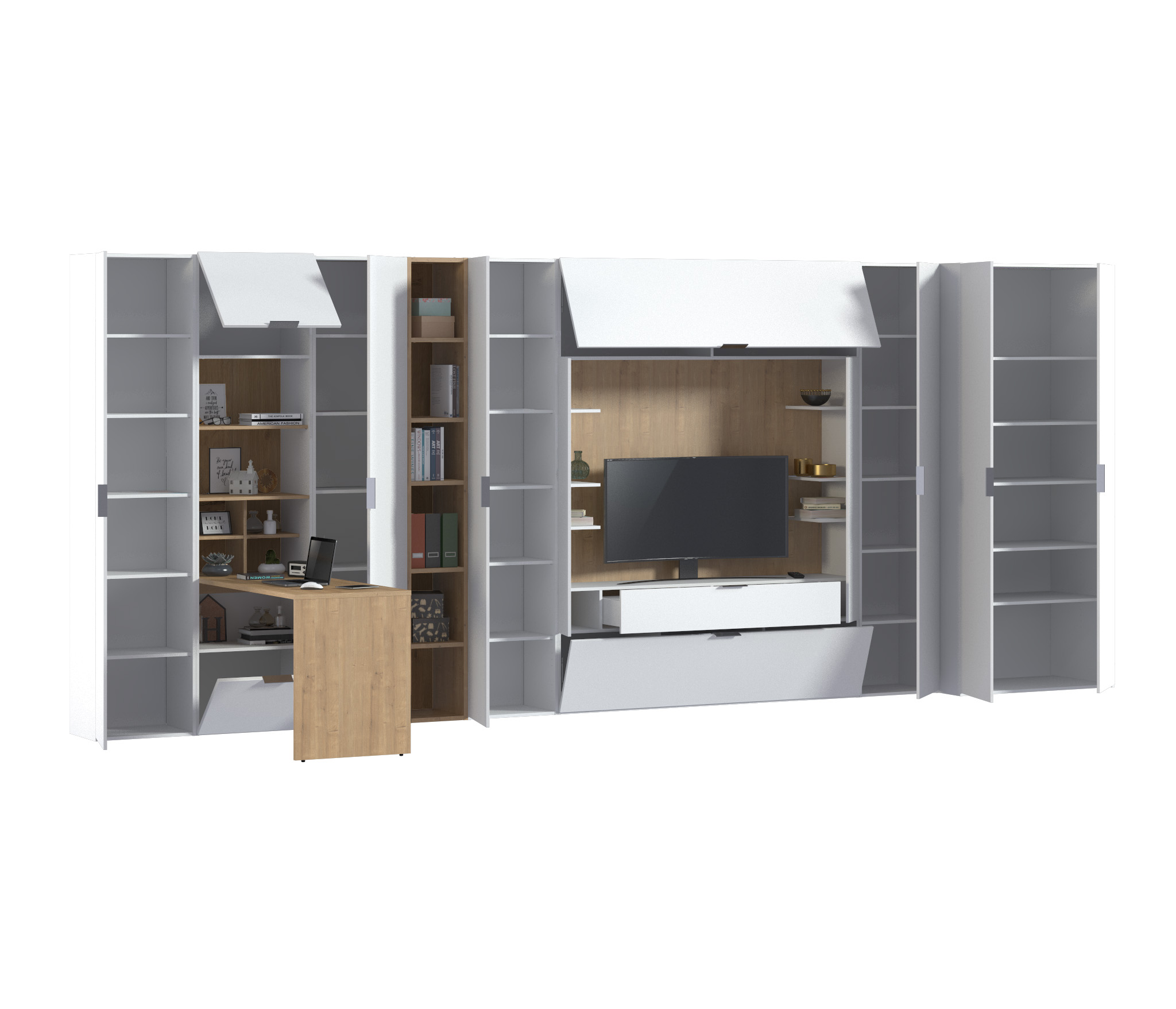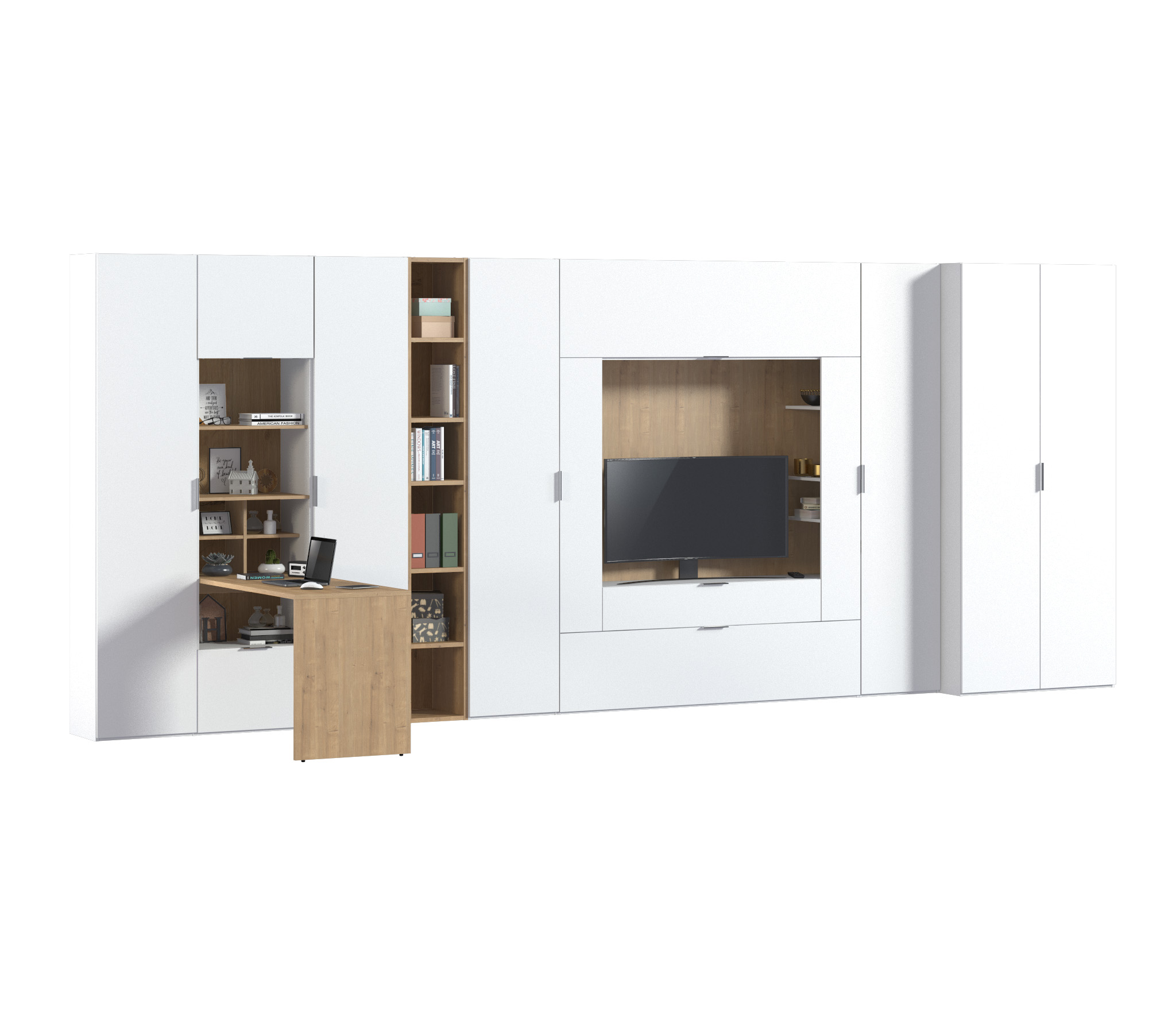 Модульная гостиная Мальта создана для ценителей стиля. Белый цвет мебели зрительно расширяет границы комнаты и делает интерьер светлее, а текстура дерева создает атмосферу уюта и близости к природе. Комбинируя элементы нашей новой модульной коллекции, вы сможете создать для себя неповторимый и комфортный интерьер. Высота элементов составляет 2,3 м., что позволит вам получить максимально функциональное пространство.