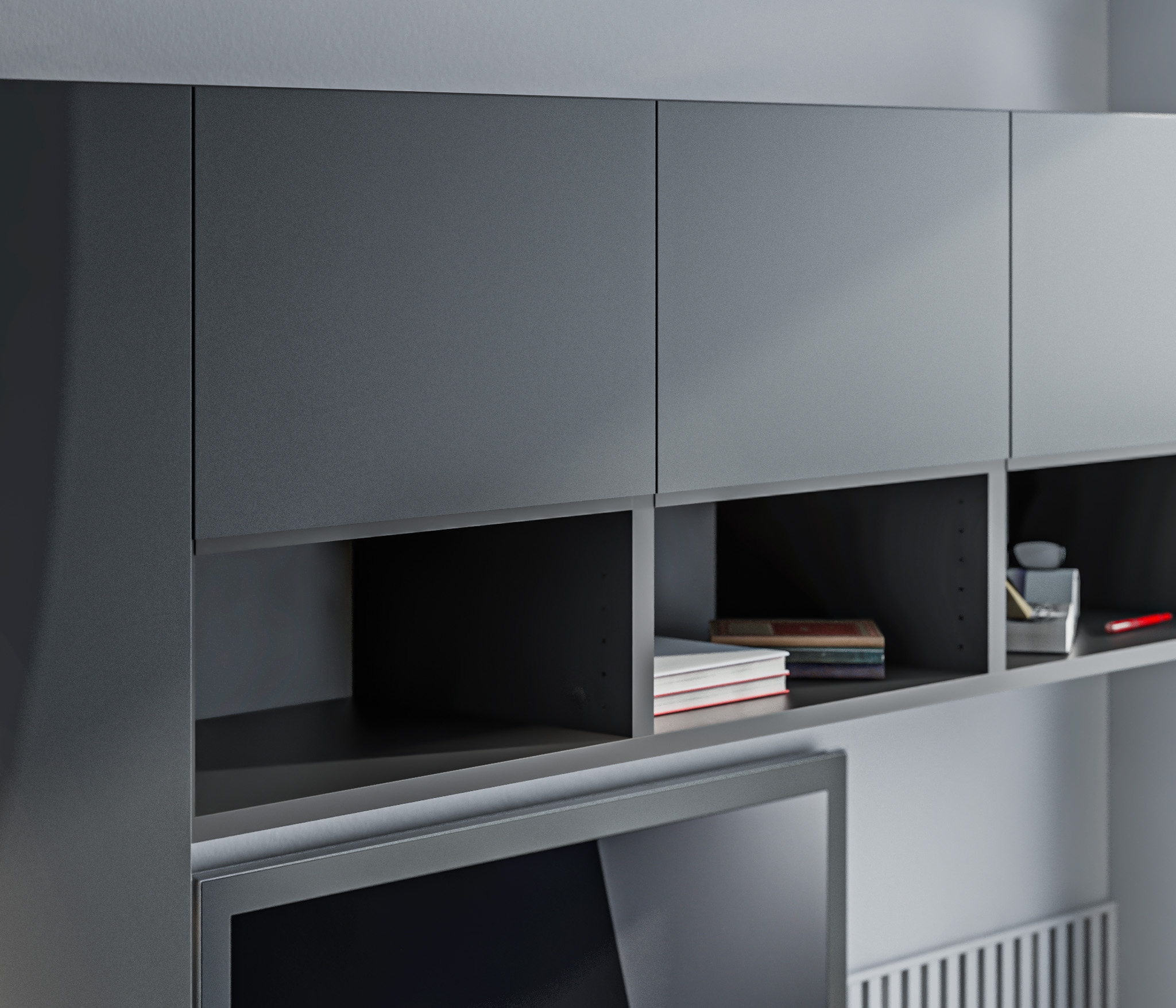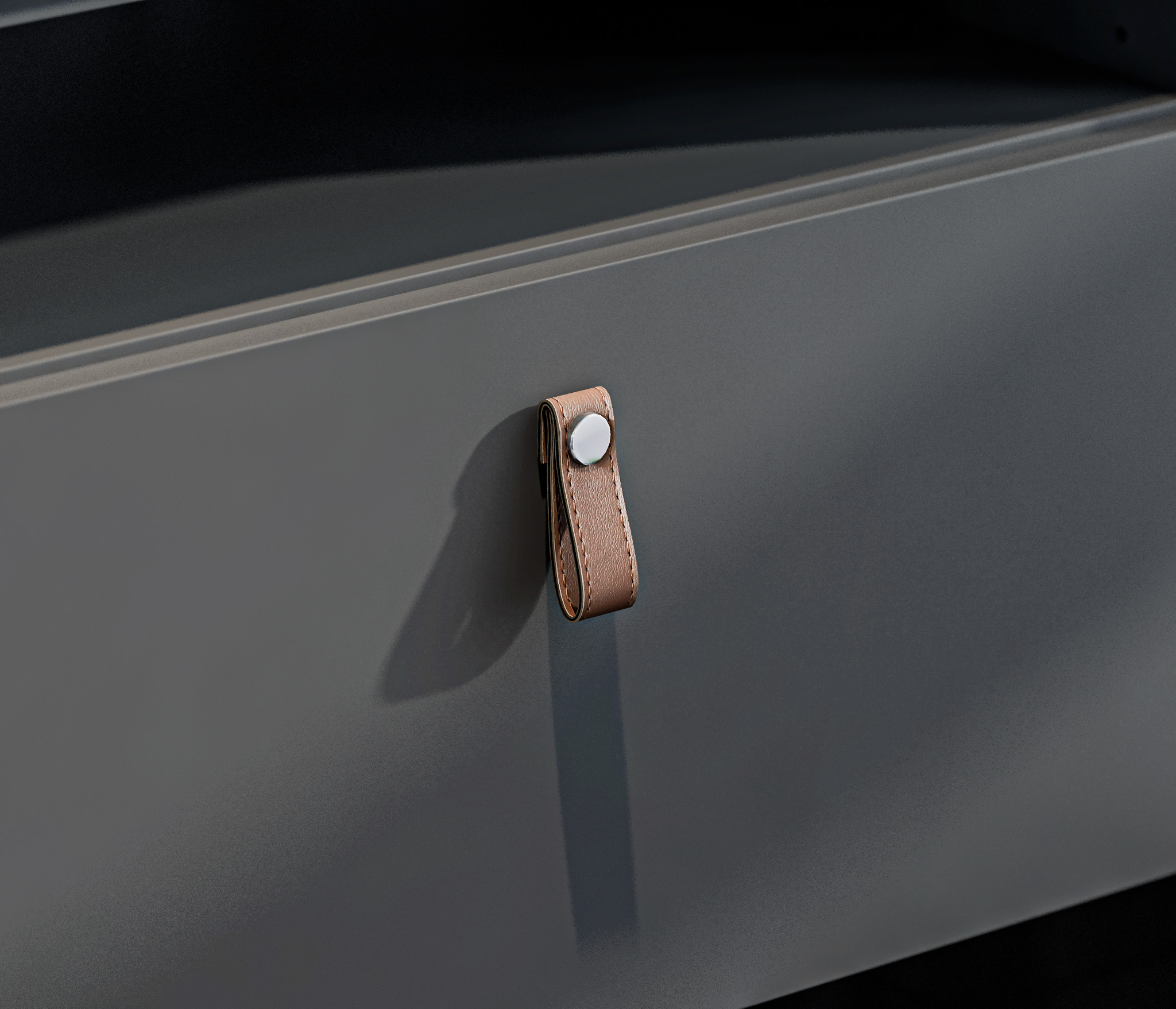 Выбор ручек является дополнительной опцией. В данной гостиной представлена ручка-кнопка в цвете хром/капучино для тумбы под телевизор и пенала, а верхняя полка оснащена механизмом Push To Open, который позволяет открывать ее легким нажатием.
