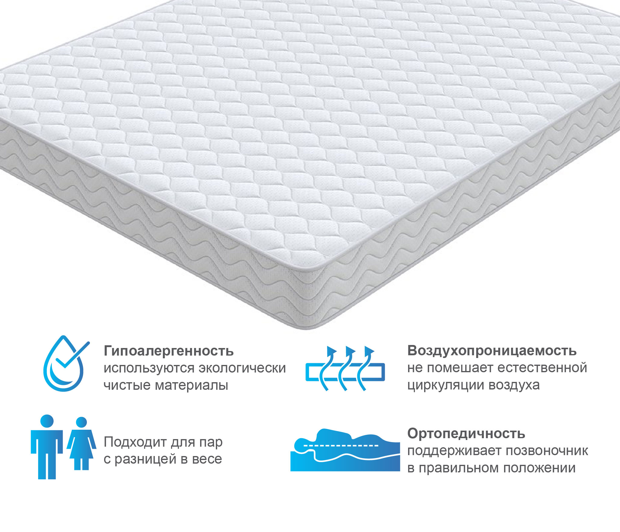 В основе матраса Спринг лежит классический пружинный блок Bonnell, который служит надежной опорой для позвоночника. Наполнитель из эластичного долговечного пенного материала делает матрас комфортным для сна и отдыха. Изолирующий слой из термовойлока придает дополнительную жесткость, а так же за счет своей объемной структуры способствует лучшей циркуляции воздуха.