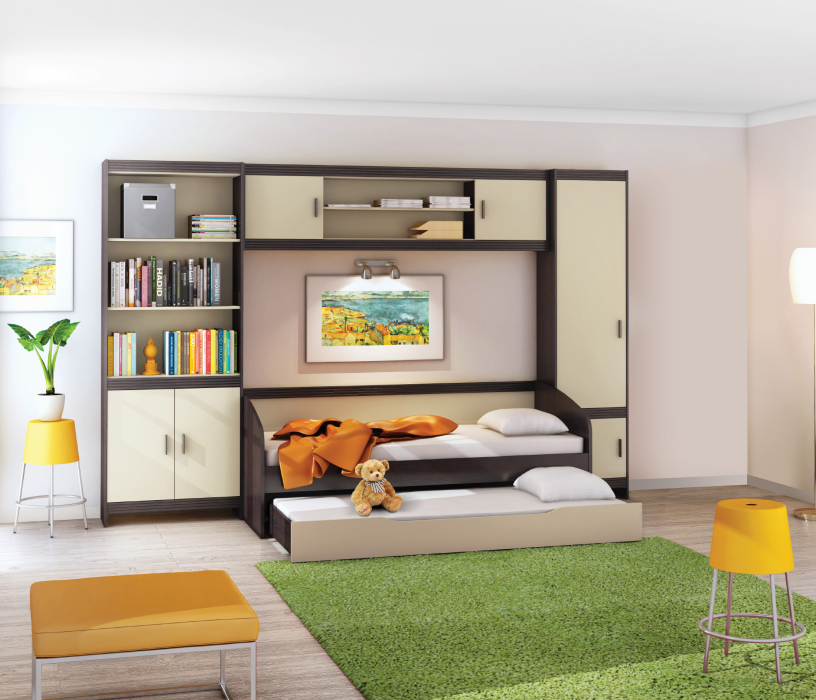 Всегда привлекало сочетание цветов Венге и светлого. У нас спальня в таких тонах. Теперь и у ребенка. Очень экономична по занимаемой площади, но так же очень функциональна. Дополнительно приобрели шкаф из этой серии. Качеством полностью довольны. Все механизмы работают как положено. Открытых полок хватает и под книги и под рамки и под мягкие игрушки. Очень удобная вещь! Рекомендую.