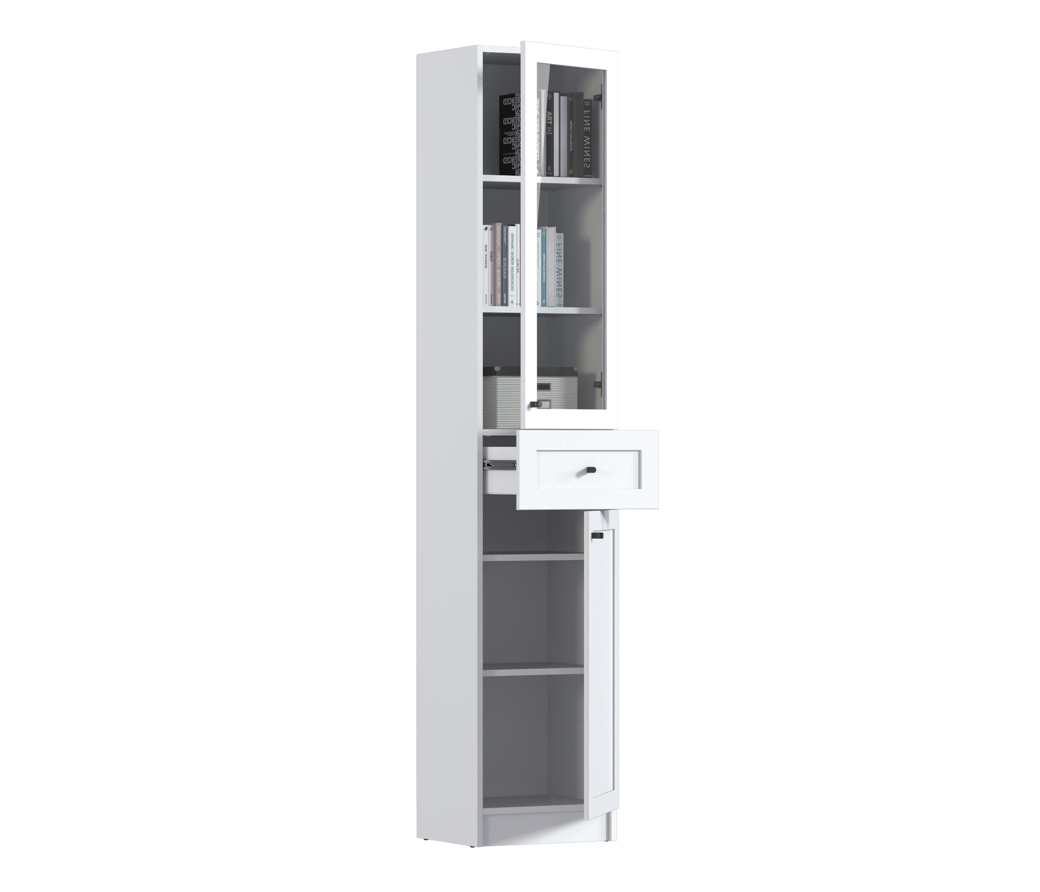 МС Твин предоставляет возможность собрать шкаф или стеллаж по своему вкусу. Вы сами выбираете размеры, цвет ручек: белый или черный, наполнение: ящик или полки. Помимо этого, вы можете решить, оставить фасады глухими или выбрать стеклянные, чтобы добавить прозрачности и легкости в ваш интерьер. Создайте шкаф-стеллаж, который идеально подходит для ваших потребностей и вписывается в ваш стиль.